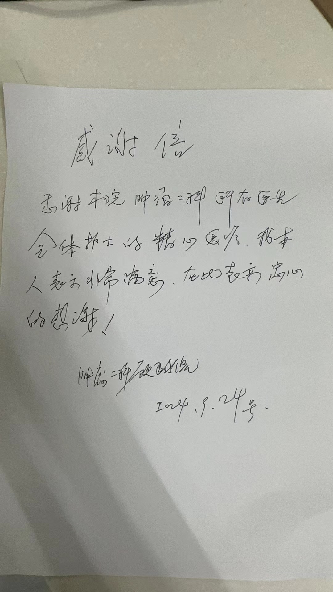 2024年9月,患者来信表扬肿瘤二科全体人员