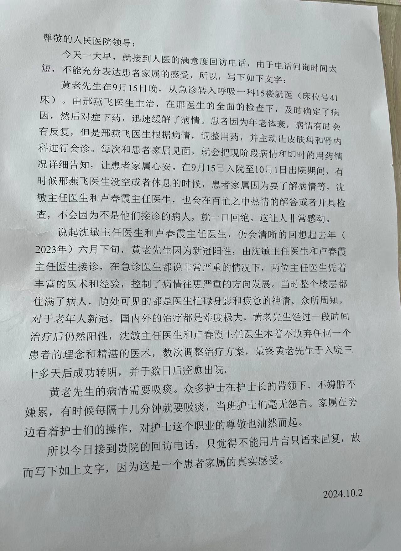 2024年10月,患者来信表扬呼吸一科邢燕飞、沈敏、卢春霞