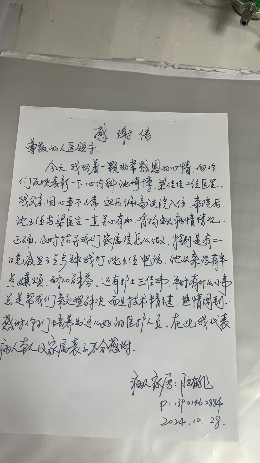 2024年10月,患者来信表扬心内二科沈琦博、梁佳佳