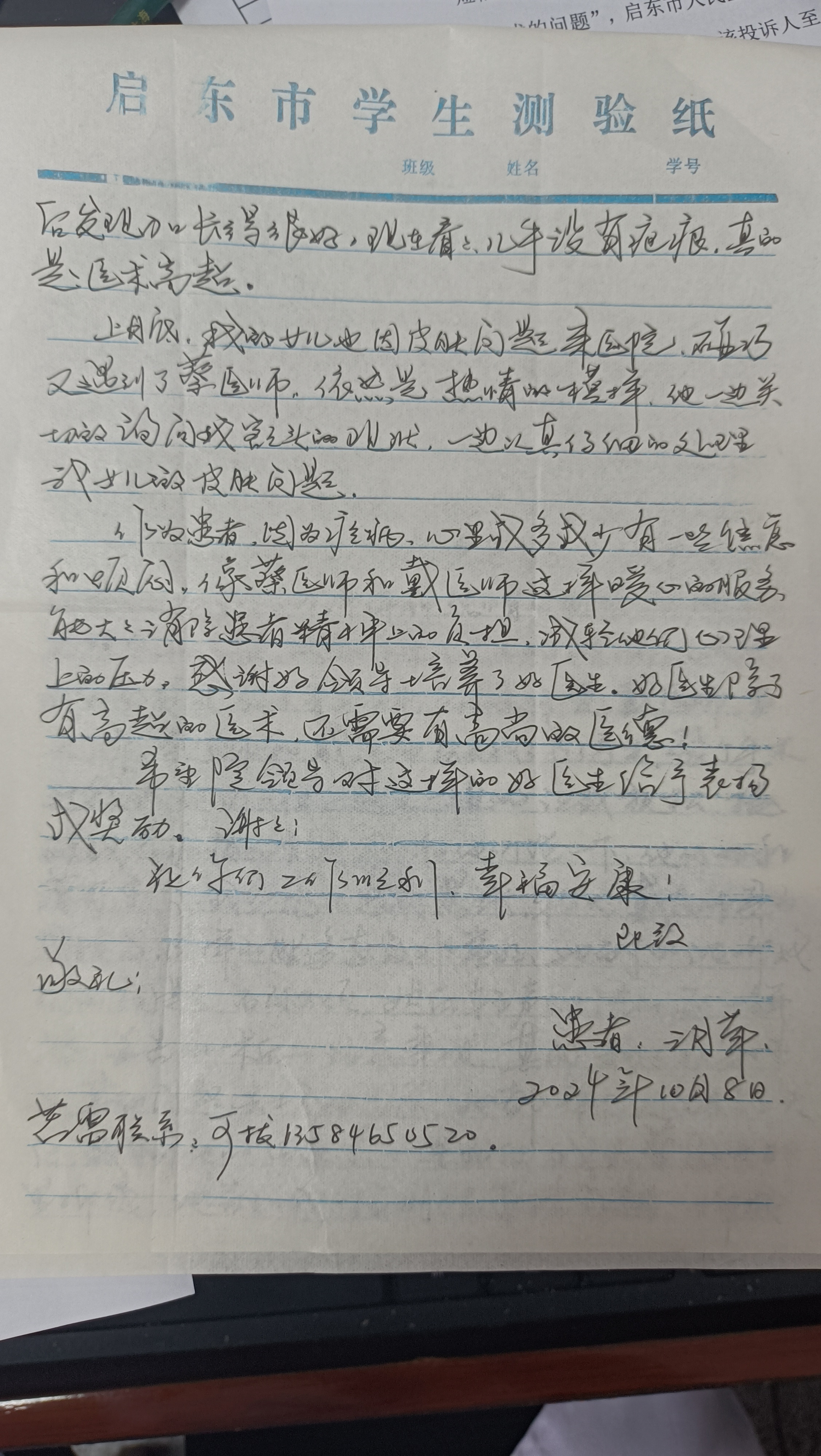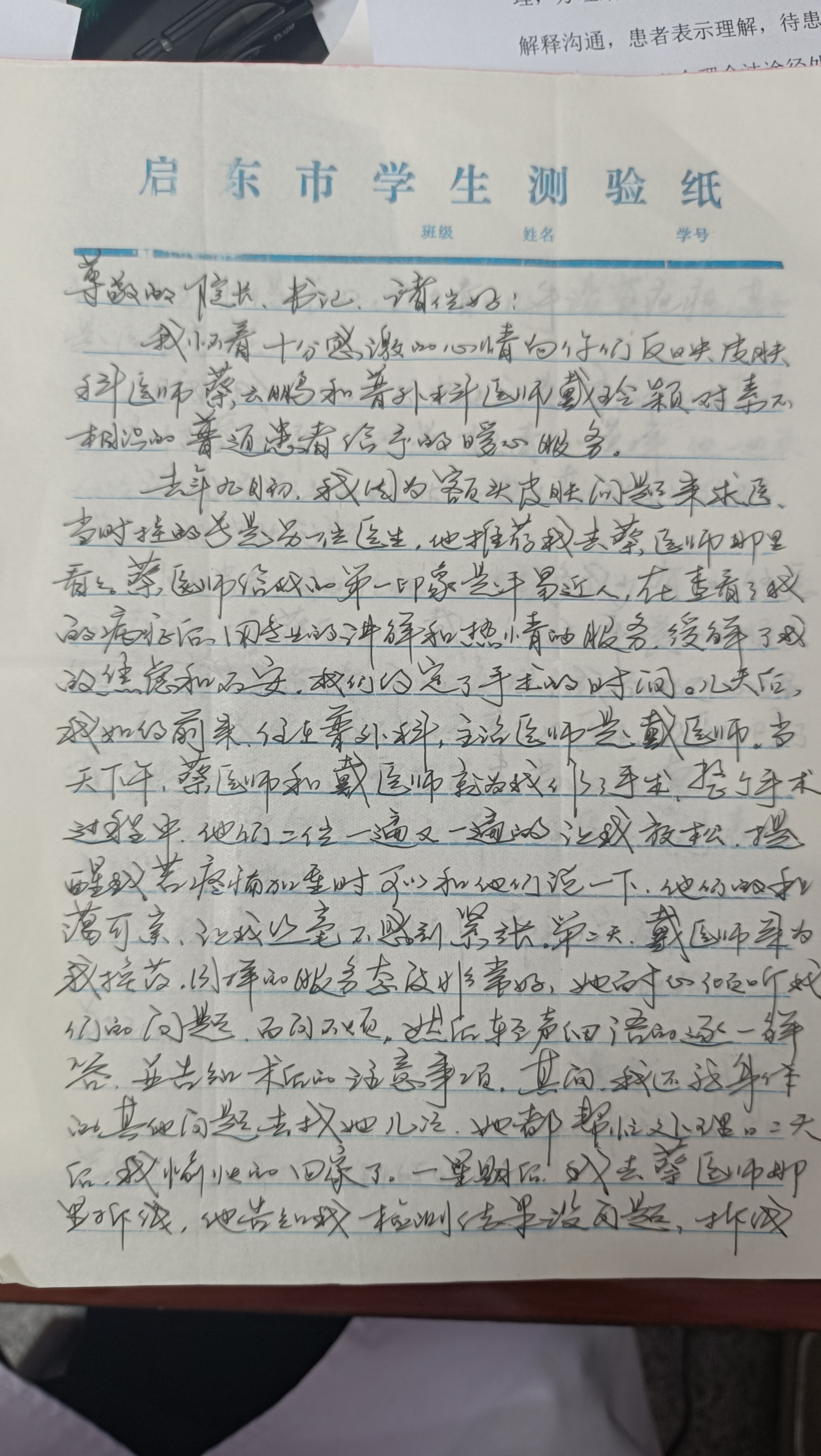 2024年10月,患者来信表扬皮肤科蔡云鹏、普外二科 戴玲颖